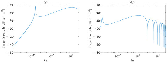 Figure 1a shows a resonance peak when , where it can be seen that the target strength first reached its maximum, then started to decline, and after that increased again. This is consistent with the variational tendency of the target strength at the acoustic frequency in the range of 10–400 kHz, as shown in Figure 2a. As shown in Figure 2a, when the acoustic frequency was in the range of 0.5–1 MHz, the value approached one, so the first resonance peak was missed. When , the changing trend of the target strength entered a continuous period of oscillatory decline, as shown in Figure 1b. This explains the phenomenon of multiple stripes existing in Figure 2b, representing the target strength alternately rising and falling.