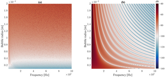 The accuracy of this solution is reduced to the case where . Therefore, this study uses the modal solution presented by Anderson to model the backscattering cross-section of a single bubble precisely for [29]. In addition, the formulation used by Berges [18] is adopted, and the backscattering cross-section is given by