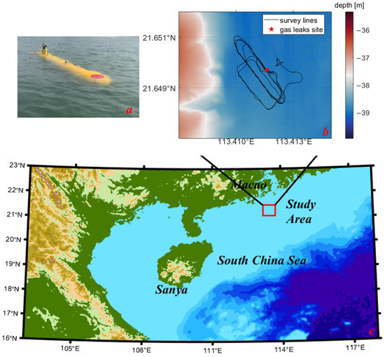The study area was located on the continental slope off China’s shore in the northern South China Sea, as shown in Figure 6c. The water depth in the study region was approximately 35 m–40 m. The gas leakage device was positioned on the seabed ( N, E) at a water depth of approximately 37 m. Figure 6b, shows the gas leakage site, marked with a red star. Gas was pumped to the seabed using a gas compressor.