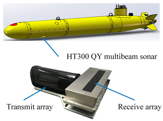 Acoustic backscattering data were collected by an HT300 QY multibeam sonar developed by Harbin Engineering University in China. The sonar was equipped with an AUV, which was designed to detect subsea pipeline leakages. As shown in Figure 7, it was mounted on the bottom of the AUV during the day survey on 20 August 2020. The multibeam sonar could detect acoustic targets in the water column with a high spatial and temporal resolution over a fan observation area of with a step of . It emitted an acoustic wave with a frequency of 300 kHz and a CW pulse signal with a pulse width of 35 s. There was a total of 512 beams in the ping fan, and a sampling frequency of 22.22 kHz was used in the beam pattern with a ping rate of 1 Hz. The locations of the detected gas bubbles were accurately determined with a distance resolution of 0.07 m and an angular resolution of , corresponding to at most 0.7 m at the maximum range of 40 m.