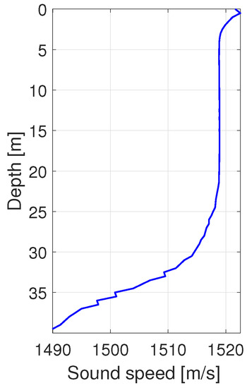 The AUV position was recorded by an integrated navigation system, which consisted of the inertial navigation unit (INU), a doppler velocity log (DVL), and a global positioning system (GPS). The positioning accuracy of the integrated navigation system is shown Table 1. The sound speed at the depth of the multibeam sonar was measured continuously using the MiniSVS developed by Valeport Company, Totnes, UK. The sound speed profile measured by the RBRconcerto CTD (PBR, Ottawa, ON, Canada) in the study area is presented in Figure 8. The acoustic absorption profile was calculated using the temperature, salinity, and depth data by the empirical formula derived by Wilson [37].