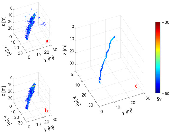 Using a steered narrow beam of a multibeam sonar allows precise determination of echo sources and therefore provides accurate positioning of the gas leakage site on the seafloor. When the offset of the gas leakage caused by the sea current rises, the gas leakage plume is mostly inclined. Along the AUV track, a detailed 3D multibeam sonar image can be obtained by a sequence of WCIs. As shown in Figure 11, a 3D structure of a gas leakage plume can be reconstructed by clouds of strong scatter points and described in physical terms, such as the position and volume. In addition, sidelobe artifacts and unfiltered noise are also output to the 3D space and appear as strong 3D structures that interfere with the 3D structure of a gas leakage plume. To address this problem, artifacts and noise need to be excluded and removed from the 3D point cloud data. Furthermore, sidelobe-induced interferences can be excluded by eliminating data that have been recorded beyong the minimum slant range (i.e., the shortest radial distance between the multibeam sonar and the seafloor).