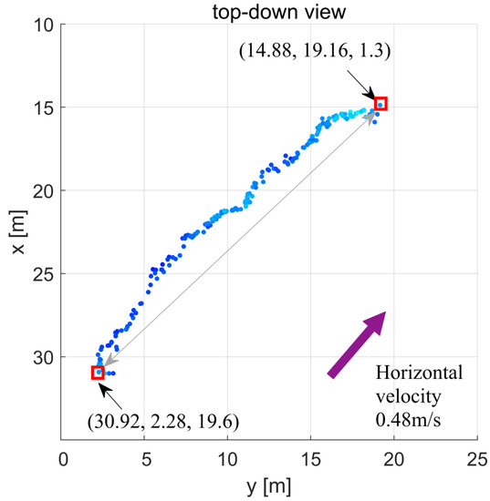 As illustrated in Figure 12a, all data beyond the minimum slant range were excluded, and the gas leakage plume could be detected in 3D point clouds. For the 3D point cloud data of the multibeam sonar, the noise points were generally far away from the target point cloud. The distance between the noise point and the neighbor point was larger than the distance between the target point cloud and the neighboring point. Statistical filtering was used to clean the leakage flare, as shown in Figure 12b. Based on the k-nearest neighbor search in the KD tree, each point in the point cloud chose an appropriate neighborhood and computed the average distance from the center point to all neighboring points. Points whose average distances were outside the standard range were defined as outlier noise points and eliminated from the data by statistical analysis, using the global distance as a judging criterion [38]. However, when the acoustic signals of the gas leakage plume were beyond the minimum slant range, the source location of the gas leakage site at the seafloor could not be determined. Therefore, to position the center of the gas leakage accurately, this study sorted the measured volume-scattering strength values of the gas leakage plume, where each layer had a width of 0.2 m. The volume-scattering strength values corresponding to each layer were geometrically averaged to obtain the representative volume-scattering strength value for the strength of the gas leakage. As shown in Figure 12c, the geometric mean was calculated for each set of volume-scattering values for a certain depth range, providing a line with only one position per depth range, which was denoted as the gas leakage spine. The source point of the gas leak can be identified as the lowermost point of the gas leakage spine when it is located just on the seafloor; otherwise, the source point can be estimated by the gas leakage’s spine slope value. A top-down view of the gas leakage spine is displayed in Figure 13. Due to the effect of the sea current, the gas leakage spine was displaced by 23.29 m in the horizontal direction. The average horizontal velocity of the current was measured by the DVL, and it was approximately 0.48 m/s.