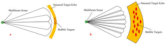 (a) Smearing effect at long range. Bubble targets were partially located in three adjacent beams, and the echo trace was smeared over the three beams. (b) Smearing effect at short range. Bubble targets were located in several beams and partially in the border beams. The target’s echo was smeared across all beams.