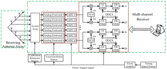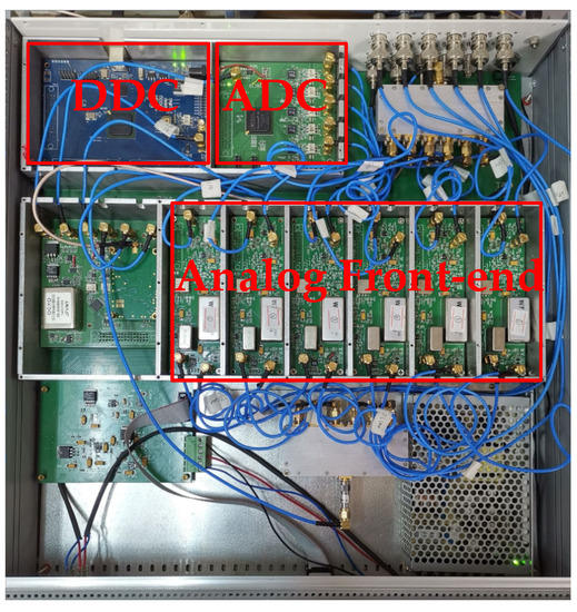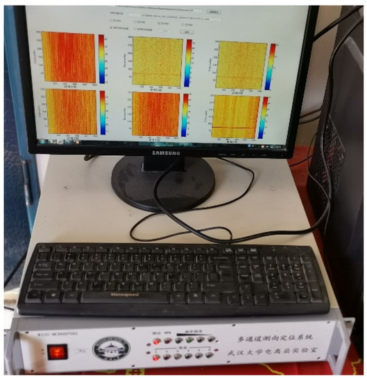 The receiving module is the core of the WMISS system, which is mainly composed of a receiving antenna array and a multi-channel receiver. Its structure diagram is shown in Figure 1. The receiving antenna is a compact “L-shaped” array, composed of 6 monopole antennas with a height of 6 m. The distance between adjacent antennas is 10 m, the actual scene and layout of the site of the “L-shape” array is shown in Figure 2. The received signal of each channel is mixed after preselection filtering to obtain an intermediate frequency signal, which is amplified to an appropriate magnitude after narrowband filtering in the analog front-ends, respectively. Then, it is sampled with high-performance analog/digital (A/D) converters, and the resulting signal is digitally mixed with a quadrature signal generated by a Numerically Controlled Oscillator (NCO), and then filtered by cascaded integrator–comb (CIC) filter and finite impulse response (FIR) filter. The baseband I/Q data stream can be obtained after filtering and decimation. Finally, the baseband I/Q data are uploaded through the USB3.0 transmission bus, and the next step of correlation operation and pulse compression processing is conducted. The signal processing part of the indoor equipment of the receiving module is shown in Figure 3. Each hardware submodule is independently encapsulated in the aluminum alloy frame, which is conducive to electromagnetic shielding between components. In the multi-channel analog front-end, each analog channel is arranged in parallel, and the adjacent channels are also isolated by an aluminum alloy frame to prevent the mutual crosstalk of electromagnetic signals. Moreover, after the local oscillator source of WMISS is sampled by A/D, it is mixed with the received signal of each channel after a one-to-six power divider (WMISS has six independent channels) to ensure the consistency of the local oscillator source of each channel. At the same time, the connection and internal wiring of each analog channel in the six channels of WMISS use equal-length wires. Finally, in order to ensure that the six channels are phase-coherent, a calibration reference source is introduced, and the amplitude and phase difference between the channels are compared and compensated in the subsequent array signal processing in the upper computer. In addition, the control part of the upper computer is shown in Figure 4, which is mainly responsible for the analysis and storage of data, and downloading instructions and various sounding parameters to the hardware platform of WMISS.
