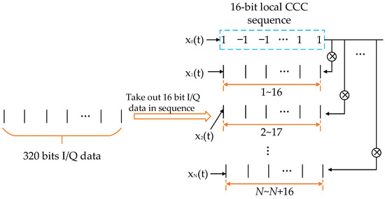 As shown in Figure 7, the 16-bit CCC sequence is used as the local code, and the time of the local code sequence is used as the benchmark; then, cross-correlation is performed with the 320-bit I/Q data received by the receiving module (because the transmitted signal is encoded with a 16-bit CCC, and the duty cycle is 5%, thus there are 320 chips, namely 320 bits). The specific process is as follows: taking out the 16-bit I/Q data in sequence; if the sequence length is less than 16 bits, fill in zero until all 320-bit I/Q data are taken out, to correlate with the local code sequence. Range bin data are obtained after each cross-correlation. Assuming that the expression of the local CCC sequence in the time domain is , the 16-bit I/Q data taken out for the first time is , as shown in Equation (7):
