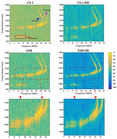 Figure 16 is the swept frequency OIS ionogram of 6~15 MHz, it comes from 12:24:59 BJT on 3 April 2021; the sunrise time is 05:55:08 BJT and the sunset time is 18:40:13 BJT. It can be seen from Figure 16 that the SNR of the echo signal has been improved to a certain extent only through Capon HRRP, and the echo trace also has some improvement. The echo trace is much clearer and more continuous after ESB algorithm processing. For example, the echo of the E-layer, which is almost invisible in Channel 1, become clearer after being processed by the ESB algorithm. However, the separation process of O-wave and X-wave in the F2-layer is not obvious at this condition. After the joint processing of ESB and Capon HRRP, it can be seen from the ionogram that the separation process of O-wave and X-wave is obvious in both the high-angle wave and low-angle wave part. The separation process is more obvious and the trace of the echo becomes narrower, which has the potential to reflect the change process of the ionosphere more accurately. At the same time, it is also very conducive to the accurate interpretation of the group distance, MUF, and other parameters.