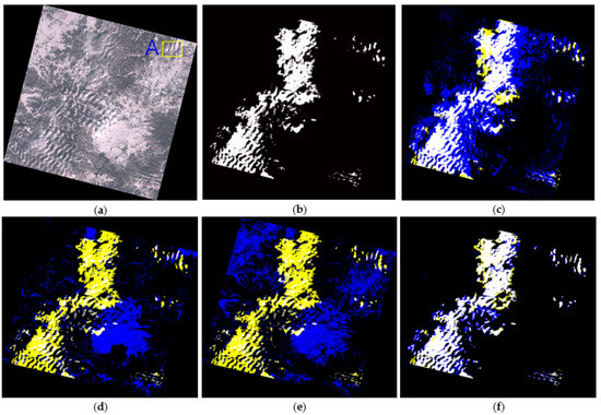 Comparison of cloud detection effects of different algorithms (the yellow area in the figure indicates the missed detection pixels and the blue area indicates the wrong detection pixels, the letter A represents the subregion of the whole image, we will discuss different algorithms performance in this area). (a) True color Landsat8 images. (b) ground truth. (c) Fmask. (d) MFC. (e) CSD-SI. (f) ours.