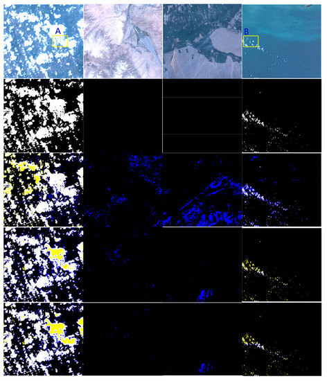Comparison of cloud detection results of different algorithms (from top to bottom, true-color image map, ground truth, DeeplabV3+ extraction result, MT-Unet, MSCFF extraction results, CDNet extraction results, RS-net, GCDB-UNet, and extraction result of our algorithm. The yellow areas indicate the missed extracted pixels and the blue areas indicate the wrong extracted pixels, the letter A/B represents the subregion of the whole picture, we will discuss different algorithms performance in this area).
