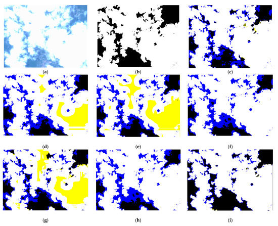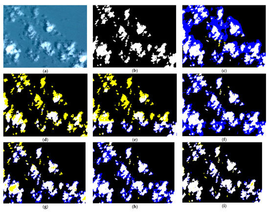 Detail comparison of different deep learning models at subregioin A (the yellow areas indicate missed extracted pixels and the blue areas indicate wrongly extracted pixels). (a) True color images. (b) ground truth. (c) DeeplabV3+. (d) MT-Unet. (e) MSCFF. (f) CDNet. (g) RS-net cloud. (h) GCDB-Unet. (i) ours.