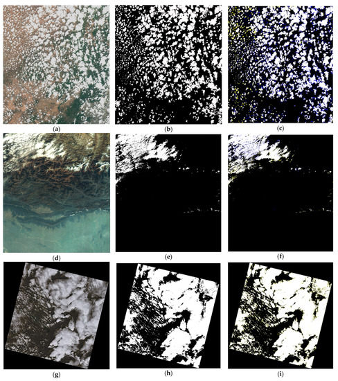 To test the generation ability of our proposed module, we use the multi-source remote sensing images in Table 2. The cloud detection results are shown in Figure 9.