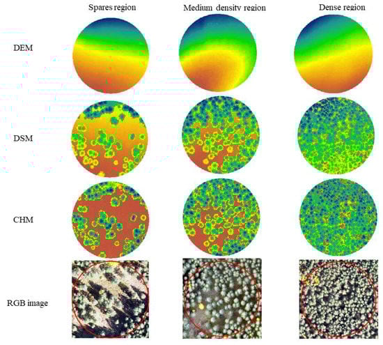 Local maps of DSM, DEM, and CHM data in different density states (taking camphor pine as an example, from left to right, these are sparse area, medium density area, and dense region).