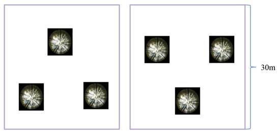 The reference data of treetop detection accuracy evaluation include two parts: field measured data and recognition results of VHR images. If the distance between the detected treetop position and the reference treetop position was less than 2 m, it was considered to be matched. The recall rate (Rc), the correct rate (Pc), and the overall accuracy F-score (Fs) were used for evaluating indices [60] as follows: