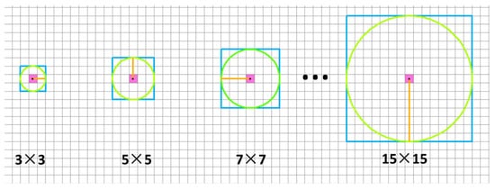 In this study, tree-crown delineation relied on the treetop results as the input data. Thus, it is necessary to explore the method of treetop detection. The classic local maximum algorithm was used in this study to detect the treetop location; its effectiveness has been demonstrated extensively [48,49,50]. The window size has an influence on the accuracy of treetop detection [51,52]. This study explored the differences of various circular window diameters (3 × 3, 5 × 5, 7 × 7, 9 × 9, 11 × 11, 13 × 13, and 15 × 15) in treetop detection and then analyzed the window sizes suitable for different scenes to optimize the result of the treetop detection (Figure 6). This operation was realized using the “lmf() function” in the “lidR’ package of R language [53], which needs three parameters. The first was window size; this study compared seven window sizes for various scenes involving six cases. The second parameter was set to 2 m, which represents the minimum height of the tree to be detected. The setting of this value was guided by several reference studies and the analysis results of field measurement data [49,54]. The third parameter was the window shape, which was set to a circle in this study.