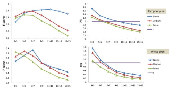 Treetop-detection accuracy in various cases. X axes refers to various treetop-detection-window sizes; y axes refer to F-scores or DR, where F-scores refer to the overall accuracy of treetop detection based on the local maximum method. The higher the value of F-scores, the higher the accuracy of treetops detected. DR denotes the detection rate, values of which close to 1 indicted a superior the treetops detected effect.