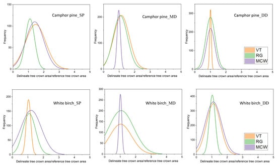 Frequency-distribution map of the ratio value of the delineated crown and the reference crown in various scenarios. Camphor pine_SP, Camphor pine_MD, and Camphor pine _DD refer to the sparse area, medium area, and dense area of camphor pine, respectively; White birch_SP, White birch_MD and White birch_DD refer to the sparse, medium, and dense areas of white birch. Orange, green, and purple lines refer to the tree-crown delineation using the methods of VT, RG, and MCW, respectively.