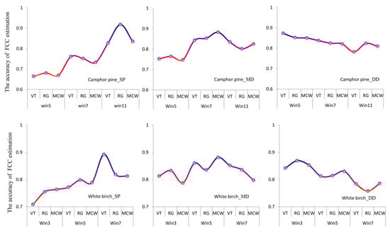 The accuracy comparison of FCC at various scenes using the method of integrating different window sizes to detect treetops and different algorithms to extract tree-crown boundaries. The three images above represent the case of camphor pine, while the three images below denote the case of white birch.