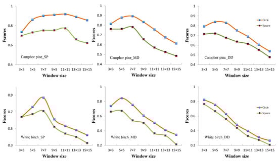 Square windows are also widely used for treetop detection. To compare the difference between these two types of window shape at treetop detection, this study conducted tree detection with circle and square windows in various cases. The results show that the value of the F-scores obtained from the square windows was lower than circle windows in most scenarios. The accuracy of treetop detection varied with different window sizes. These above results demonstrate that the performance of the circular window is preferred to that of the square window in most scenarios regardless of camphor pine or white birch. The optimal window sizes of circular or square windows in each case were similar, which indicated that the shape of the window influences the accuracy of the treetop detection of each scenario. Therefore, in treetop detection, the circular window has better performance and fits the tree-crown shape better. This result is consistent with previous studies [51,52].
