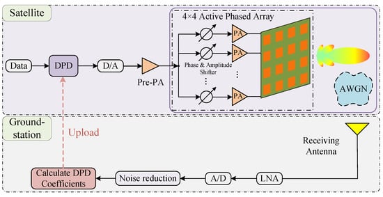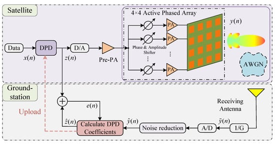 With the rapid rise of fifth-generation (5G) millimeter-wave (mmWave) communications and broadband low Earth orbit (LEO) satellites [,], active phased array (APA) antennas have seen unprecedented development in recent years [,,]. Compared with conventional antennas, APA antennas do not require bulky servo tracking systems. They can change the radiation pattern by adjusting the excitation phases of the antenna elements in the array, thus bringing advantages such as flexible beam control and high reliability [,]. Higher power efficiency is required to support high data rates operation while driving power amplifiers (PAs) close to their saturation state will introduce severe nonlinear distortion. Nonlinear distortion leads to non-negligible problems such as: interference to other satellite and terrestrial communication systems due to the increased adjacent channel power ratio (ACPR), and deterioration of the error vector magnitude (EVM) leading to higher bit error rates.