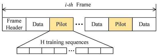 The transmission frame structure of the proposed superimposing training sequences method is illustrated in Figure 4, which mainly consists of three parts: frame header, data block, and pilot signal. The pilot signal is composed of H identical training sequences. Assume that the discrete OFDM signal subject to AWGN interference is