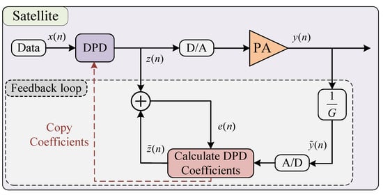 In [], the indirect learning architecture applied to PA linearization is proposed for the first time. As shown in Figure 5, in the field of satellite communications, the feedback loop for coefficient calculation is almost equivalent to a receiver that would be included in the satellite-transmitter. Therefore, the required cost is unacceptable for satellites; it is also for this reason that dynamic DPD techniques are not widely used in satellite communications. Ref. [] provides a fifth order static DPD, which means that only the static nonlinearity of the PA can be handled, while the memory effect is ignored. Such a static DPD method would not improve the performance a lot, especially for broadband signals.
