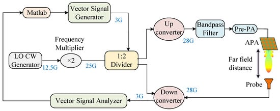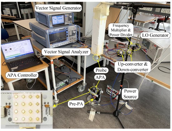 The structural block diagrams of the over-the-air (OTA) measurement equipment and the actual laboratory equipment photo are presented in Figure 7 and Figure 8, respectively. The 5G new radio (NR) intermediate frequency (IF) signal with a bandwidth of 100 MHz centered at 3 GHz is generated from a vector signal generator (VSG)(R&S SMBV100B). The Agilent E3247C outputs an unmodulated signal of 12.5 GHz, which is multiplied to 25 GHz by a MITEQ-MAX2M200400 frequency multiplier, and then sent to a power divider as a local oscillator (LO) signal for the up-converter (KTX321840) and down-converter (KRX321840). The 28 GHz bandpass filtered signal is linearly amplified by a pre-amplifier (Ducommum APH-26063325) away from its saturation region to drive the APA into its compression state. The APA device is based on the Amotech AAiPK428GC-A0404, which consists of four Anokiwave AWMF-0158 transceivers and incorporates 16 branches attenuators, phase shifters, and PAs in a 4-by-4 APA, as well as 16 patch antennas. The main beam signal is captured by an observation horn antenna. After down-conversion to IF, it is collected and converted to a baseband signal by an R&S FSW spectrum analyzer. Lastly, the baseband signal is processed by MATLAB.