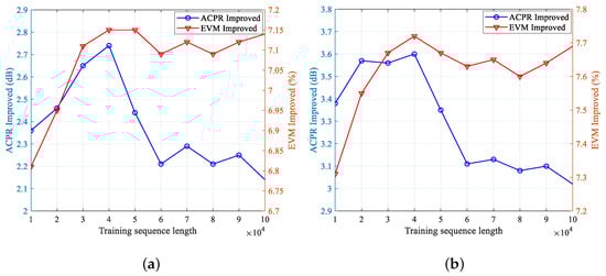 Since this part of the test is performed at the ground station (before the satellite launch), the prior knowledge about APA and an almost noise-free experimental scenario can be obtained. The experimental results are shown in Figure 9. For these two input power levels, the improvement of both ACPR and EVM is optimal for a training sequence length of 40,000. Although the EVM improvement may be better after the training length exceeds 100,000, an extra-long frame length is needed to obtain a slight improvement. Especially after hundreds or thousands of superpositions, the slight performance improvement is negligible in comparison to the cost of the frame length. Hence, the training sequence length is chosen to be 40,000 after a trade-off.