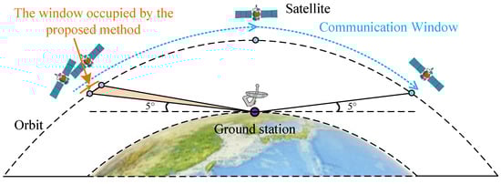 In actual communication scenarios, as shown in Figure 10, when the angle between the satellite and the ground station is 5 degrees from the horizontal, the communication is established, and the communication distance is the longest and the SNR is the smallest. It is at this moment that our proposed method starts to operate. The relative position between transceivers will change, which will lead to fluctuations in SNR. The SNR variation throughout the communication window may exceed 10 dB [], but our proposed method is only used when communication is just established. The SNR fluctuation range is approximately 10 dB to 10.5 dB, which is not a large enough fluctuation to affect the experimental results. Therefore, for the convenience of the calculation, we assume a constant SNR of 10 dB.