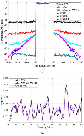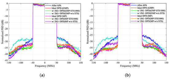 where is the actual output of the APA, and is the output of the APA obtained by model fitting. Thus, the optimal parameters selected for the GMP model are 3, 5, 2, 3, 2, 3, 2, 2, which represent the nonlinear order and memory depth of the MP sub-model, lagging envelope term, and leading envelope term, as well as the additional degrees of freedom of the lagging and leading term. In this paper, experiments were also conducted on the MP model for comparison. For fairness, the nonlinear order and memory depth were chosen as three and five, respectively, which are consistent with the MP sub-model of the GMP model. As can be seen from the results in Figure 14 and Table 1, for the case of stronger nonlinearity (input power level: −24 dBm), the application of the proposed JSG-DPD method improves the upper and lower ACPR average performance by nearly 4 dB for a training sequence superposition of 1000 or 100 times with the GMP model, especially the EVM performance by more than 7.5%, which undoubtedly enhances the quality of the transmitted signal significantly. The ground station is more concerned about the improvement status of EVM than ACPR. When the number of training sequence superposition is 10, there is also an improvement of nearly 6.5% in EVM, which is still promising. In contrast, the results without the STS method improved the EVM slightly. In addition, for the results of the MP model, the improvement in EVM is not as good as that of the GMP model, with a difference of about 0.2% to 0.4%. Nevertheless, it is noteworthy that using the MP model without the STS method still improves the ACPR by 2.5 dB, while the ACPR results with the GMP model without the STS method have deteriorated to the extent that it seriously affects the signal transmission in the adjacent channels.