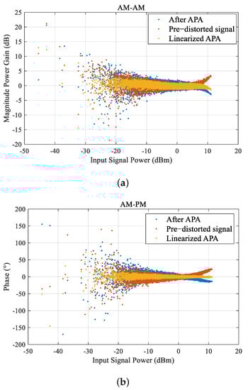 Measured AM-AM and AM-PM curves with the proposed technique for 100 MHz OFDM signal: (a) AM-AM; (b) AM-PM.