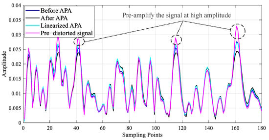According to the DPD structure introduced in the previous sections, the GMP model is applied to model the APA system and generate the predistorted signal. Figure 12 shows the AM-AM and AM-PM curves of this APA system. The predistorted signal forms an inverse relationship with the original APA output signal, which makes the combined pre-distorter and the APA approximately linear. The time-domain signal comparison in Figure 13 reveals that the most effective strategy of the DPD technique is to pre-amplify the signal at high amplitude so that after the nonlinear APA gain compression, the same linear gain can be achieved as at other low amplitude.