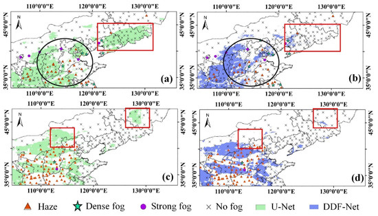- The DDF-Net could detect large-scale fog and has a more refined identification of the edge of the fog area. Both the DDF-Net and U-net are challenged in detecting fog during the periods of time when the fog is dissipating and when there are clouds, while the FAR of DDF-Net is lower than the latter.