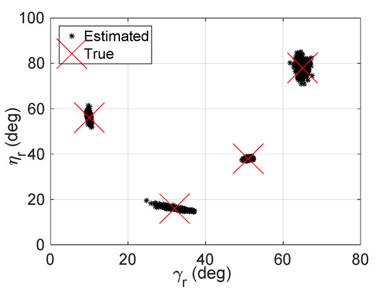It has been stressed that our algorithm is able to deal with a coherent target, thus the identifiability of the proposed algorithm should be analyzed from two aspects: the identifiability of the coherent target and the identifiability of the non-coherent target. For the coherent target, the maximum identifiable number equals to the maximum rank of for the rank-one , which is (suppose that ). On the other hand, the maximum detectable target number of the non-coherent target is constrained by the rank of (or ), which is . In contrast, the PS algorithm in Ref. [26] can detect at most MN non-coherent targets and 72 coherent targets, while the abilities with respect to the algorithm in Refs. [26,27,28] are MN, 36, and 36, min{MN, 36}, respectively. Table 1 lists the identifiability comparison of the various approaches. Obviously, the proposed algorithm has better identifiability than Refs. [26,27].