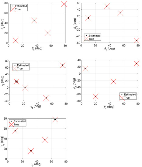 From the above comparison, one can see that our algorithm has much better identifiability than that in Refs. [26,27], especially in the presence of massive MIMO configurations. Besides, it should be emphasized that both Refs. [26,27] cannot offer 2D direction angle, while the proposed algorithm can not only provide 2D elevation/azimuth angle estimation, but also 2D polarized parameters estimation, which is more flexible than Refs. [26,27].