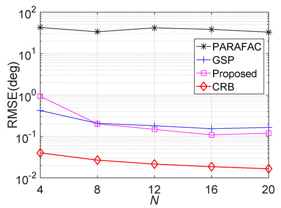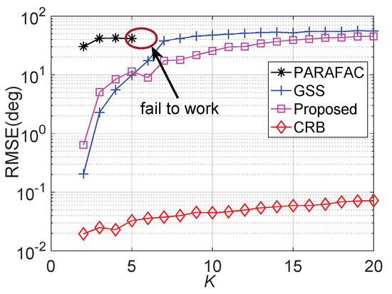 . The average RMSE comparison versus snapshot number L is displayed in Figure 6, where M = 6, N = 8, , and SNR = 15 dB. We can see that larger L will improve the estimation accuracy, except for the PARAFAC estimator. Obviously, the proposed algorithm outperforms the GSS approaches during the entire L regions, especially in the presence of small L values, e.g., when L is smaller than 80.