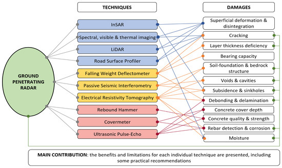 In this paper, a critical review of GPR combined with several other NDTs (e.g., visible and thermal imaging, Light Detection and Ranging (LiDAR), covermeter, deflectometers, Schmidt hammer, the Seismic passive method, and ultrasonic pulse-echo) is discussed to provide a systematic recommendation to overcome current challenges in the field of road pavement assessment. Figure 1 shows the main contributions of this study. In order to maximize the benefit obtained through the combined use of GPR with other NDTs, different road pavement damages that normally occur are addressed herein, from superficial distresses to internal failure and subgrade dysfunctionality. What is more, for a more complete analysis, both flexible and rigid pavements are considered, covering all types of roads based on function (e.g., highways, runways, and urban and rural roads). Hence, through the review of the published literature, the main benefits and limitations of each individual method are presented, providing the most interesting combinations and some practical recommendations.