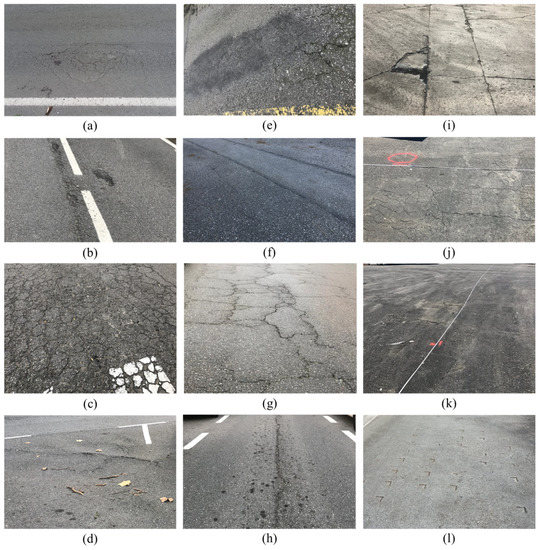 Examples of superficial distresses in both flexible (a–h) and rigid (i–l) pavements.