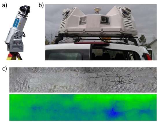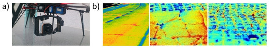 Visible imaging detects the three wavelength bands of the electromagnetic spectrum or the visible spectrum (400–700 nm): red, green and blue (typically called RGB imaging). The RGB camera can operate mounted on an UAV or in a vehicle. However, the operation mode influences the accuracy and reliability of the data. A resolution less than 0.2 mm can be achieved when operating with the camera mounted in a vehicle and close to the road surface, although costly [54]. Conversely, the resolution is not less than 7 mm if mounted on UAVs. Moreover, data quality is influenced by other conditioning factors such as proper illumination and atmospheric conditions (e.g., fog, heat, and sandstorms) [44].