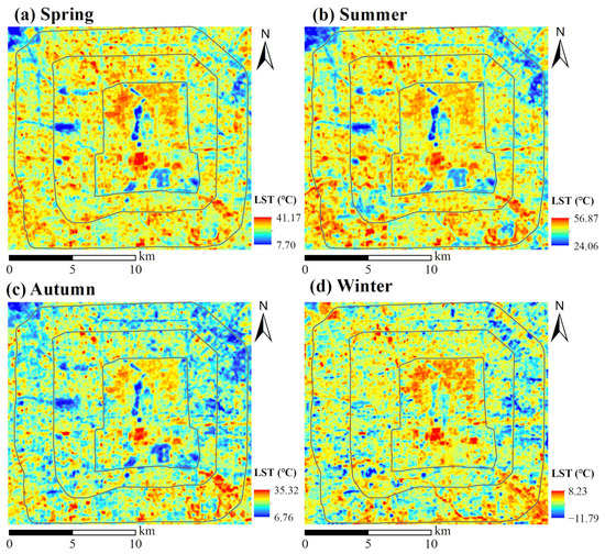 Spatial distribution of land surface temperature (LST) in: (a) spring, (b) summer, (c) autumn, and (d) winter.