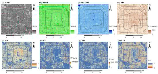The LST in urban areas is mainly determined by complex urban landscapes. According to previous studies, the driving factors of LST can be categorized into three layers: urban greenness, wetness, and grayness (Table 1). In this study, three surface biophysical factors (NDVI, NDBI, and MNDWI) were selected to represent the overall spatial distributions of urban greenness, grayness, and wetness, respectively, from a two-dimensional (2D) perspective. Buildings and roads are two typical artificial construction types in urban areas, as well as the main components of urban grayness. In this study, we employed RD, BD, BH, BV, and SVF to describe the detailed spatial characteristics of the urban grayness components from 2D and 3D perspectives. The BD was defined as the proportion of the ground building area per unit of analysis, and RD was defined as the total length of the roads in an analysis unit divided by the area of the unit. The BH was defined as the average height of the buildings per unit of analysis, and BV was defined as the total building volume per unit of analysis. Furthermore, was defined as the proportion of visible sky at a certain observation point and was calculated based on the buildings, according to the method proposed by [39]. Then, all the values per analysis unit were averaged. Since seasonal effects were considered in this study, the three surface biophysical factors chosen in this study were calculated separately from four Landsat-8 images captured during the different seasons, whereas the building and road-related factors were considered to be the same for all seasons. The spatial distributions of the selected environmental factors are shown in Figure 3.