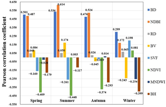 The average correlation between the LST and environmental factors with respect to different seasons is shown in Figure 4. The Pearson correlation coefficient indicated the direction and intensity of the correlation between the LST and environmental factors. The average correlation results were at the 95% significance level. In terms of the direction of correlation, all factors, except BV, SVF, and NDVI, exhibited consistent correlations with the LST in Beijing across all seasons. In addition, the correlation strengths between the urban environmental factors and LST were strong in summer and weak in winter, in terms of the strongest correlation factors.