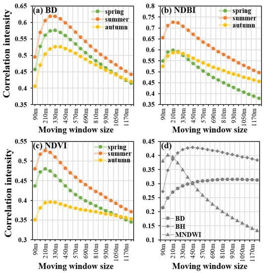 We selected three factors for spring, summer, and autumn (BD, NDBI, and NDVI) and winter (BD, BH, and MNDWI) for further analysis, according to their strong correlations with the LST (Figure 4). This exploration was conducted with various window sizes, i.e., from 90 m to 1230 m, with an interval of 60 m, to reveal the effect of scale through the change in the correlation strength. The influence of the BD, NDBI, and NDVI factors on the LST showed a similar trend, i.e., an inverted V shape with increasing window sizes in relatively warmer seasons (spring, summer, and autumn) (Figure 5a–c). First, the correlation intensity increased with the moving window size and then decreased gradually, which indicated the optimal spatial scales to study the influence of the neighboring environments on the LST. For the BD factor, the intensity of its positive correlation with LST showed an initial sharp rise, followed by a gradual decline after reaching the peak; the peak correlation intensity was obtained when the window size was set at 270 m (summer) and 330 m (spring and autumn). The intensity curve of the NDVI factor associated with LST showed a trend similar to the intensity curve of the BD–LST correlation. The spring curve was located between the summer and autumn curves, and the maximum correlation intensity corresponded to a window size of 210 m (spring and summer) and 270 m (autumn), although the NDVI was negatively correlated with the LST. Similar to the results of BD and NDVI, the summer curve of the NDBI was also at the top, indicating that these environmental factors were most associated with the LST in summer. The difference between the first two was that the gap between the spring and autumn curves gradually increased with the size of the moving window. However, the strongest correlations between the NDBI and LST still occurred at window sizes of 210 m (spring and summer) and 270 m (autumn). The general and intuitive correlations between the environmental factors and LST are shown in Figure 4. The comparative analysis between the scales further revealed that the scales of 210–270 m were more effective in capturing the spatial characteristics of these correlations, regardless of whether the factors were positively (NDBI and BD) or negatively (NDVI) correlated with the LST.