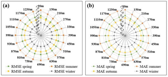 The LST is the result of the combined effects of multiple factors. Therefore, in this study, the XGB regression method was adopted to construct the LST regression models for different spatial scales in order to investigate the combined effects of these factors on the LST of the city. The explanatory rate indicator, i.e., the percentage of LST variance explained by the regression model, was used to measure the combined effects of these factors on the LST [48]. Figure 6 shows that the RMSE and MAE metrics are lower than 1.6 and 1.2, respectively. Table 2 summarizes the explanatory rates at different scales. For each season, the same color scheme was used to portray the change in the explanatory rate with scale. Green indicates a low explanatory rate and yellow indicates a high explanatory rate. For the spring and summer LST, the XGB regression models established at 210 m had the highest explanatory rate (74.94% and 77.55%, respectively), followed by the model established at 270 m (74.62% and 77.34%, respectively). For the autumn LST, the model established at 270 m had the highest explanatory rate (68.04%), followed by that established at 210 m (67.53%). These results indicated that, when studying the LST during the warm season, the multiple regression model had the strongest interpretation of the LST at a spatial scale of 210–270 m.