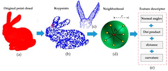The feature description proposed in this paper is mainly divided into four steps: (1) calculating the normal angles, (2) calculating the dot product, (3) calculating the distance between the specified point and neighborhood points, and (4) calculating curvature variation. Figure 1 shows the schematic of the proposed method.