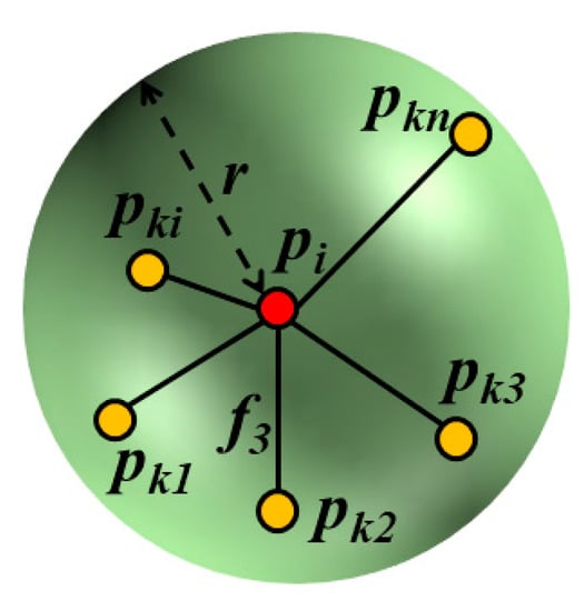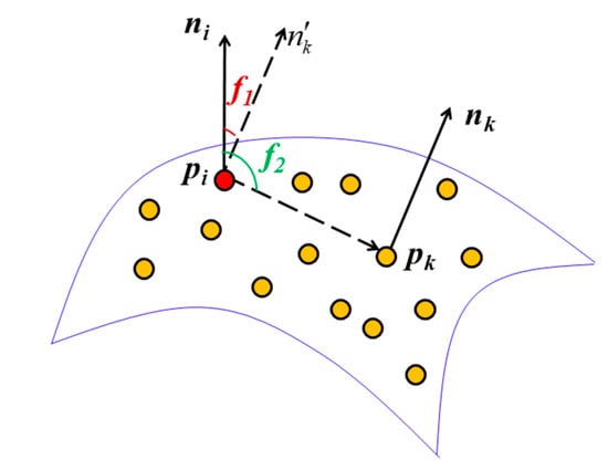 For the neighborhood of a specified point, the angle of normal and vector from the specified point to its neighborhood point generally differs. Therefore, the feature can be described by the dot product of normal and vector from the data point to its neighborhood point. It is assumed that is the vector from the specified point to its neighborhood point . The dot product of the normal vector and is expressed as follows.