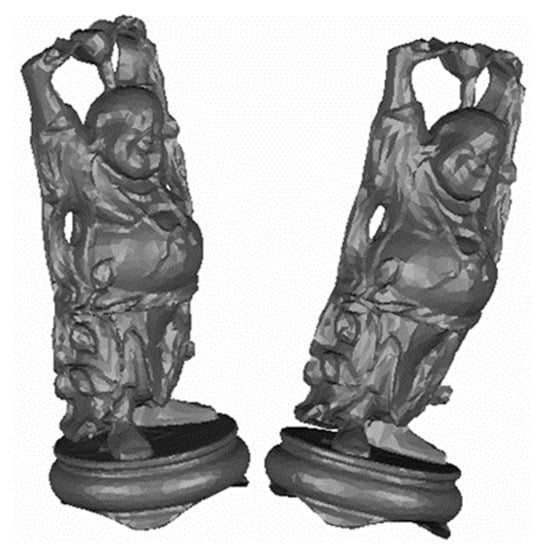 The registration result of the Happy Buddha based on FPFH, SHOT, RoPS, and our proposed method is shown in Figure 10. The FPFH, SHOT, RoPS, and our descriptor also successfully register the real datasets. The visual result of our descriptor has less distinctive patches of red or blue. The details of the Happy Buddha edge also visually show the performance of our descriptor is better than FPFH, SHOT, and RoPS.