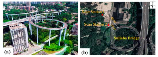 Photos showing Sujiaba Bridge. (a) UAV image of Sujiaba Bridge; (b) the schematic diagram of scan station in Sujiaba Bridge and the background is from Google Maps. The scan station 1 is 48 m away from the bridge and station 2 is 19 m away from the bridge.