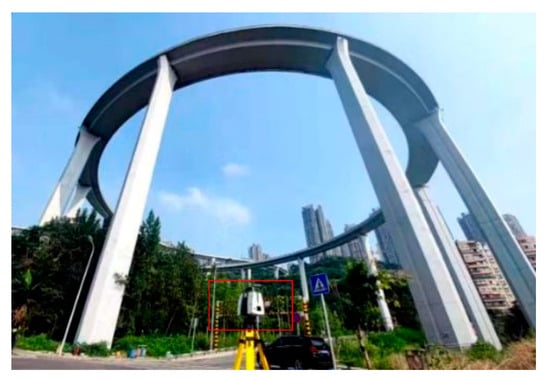 We collected TLS data of Sujiaba Bridge in two stations on 8 July 2021. The Sujiaba Bridge TLS data acquisition in scan station 1 is shown in Figure 6. The Leica P50 scanner was set near the bridge, the scanning range mode was set at 0.4~270 m, and the scanning resolution was set at 3 mm @ 10 m. The original point clouds of the bridge are shown in Figure 7.