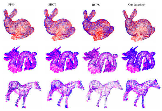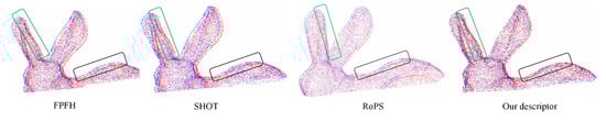 The experimental result of point sets with an overlap percent of 0.6 is shown in Figure 8. It can be seen from Figure 8 that FPFH, SHOT, RoPS, and our descriptor all successfully register the datasets. The visual result of our descriptor has less distinctive patches of red or blue except for the non-overlap area. More explicitly, the enlarged registration result of the Bunny based on three descriptors is shown in Figure 9. The details of the ears and backs of the Bunny, based on our descriptor, achieve the best performance. Moreover, the details of other point clouds, such as the beards and tails of the Dragon, hooves, and mouth of the Horse, also visually show that the performance of our descriptor is better than FPFH, SHOT, and RoPS.