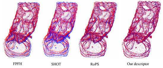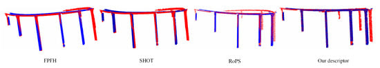 The time consumption of our descriptor is obtained with similar accuracy. However, it should be noted that the time of our descriptor is the smallest. It is mainly because the method proposed has a low calculation dimension. The dimension of our descriptor is 32. Meanwhile, the FPFH is 33, the SHOT is 352, and the RoPS is 135. Although FPFH has only 33 dimensions, the extraction time is high because SPFH is calculated twice [].